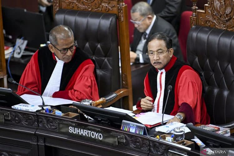 TIMES Tangsel/Ketua Mahkamah Konstitusi (MK) Suhartoyo (kanan) bersama Wakil Ketua MK Saldi Isra memimpin sidang pengucapan putusan perkara dilanjutkan atau tidak (dismissal) sengketa Pilkada 2024 di Gedung Mahkamah Konstitusi, Jakarta, Rabu (5/2/2025). (ANTARA)